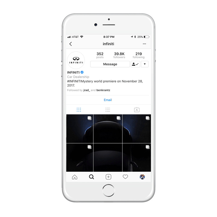 To hype the global launch of the INFINITI QX50 at the LA Auto Show, we wanted to tease the fans and create buzz around which model INFINITI would release. We created #INFINITIMystery - a 15 post Instagram grid teaser campaign. Never mentioning the car by name, each post and story contained hidden easter eggs and videos that highlighted features of the car. A few lucky fans dug deep enough and solved the mystery and were able to attend the live model reveal. This included more QX50 content to really celebrate this launch.